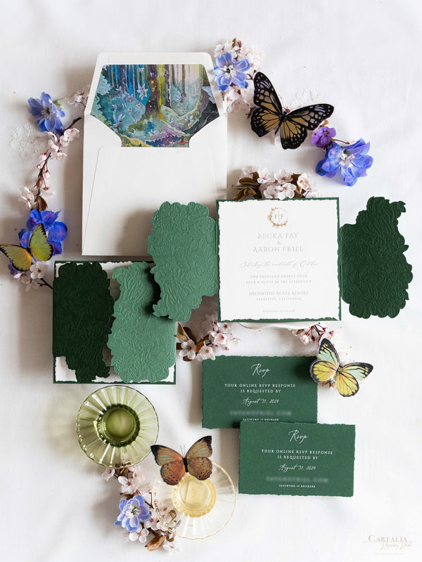 Luxury Gold Foil Invitation pocket fold suite for Wedding Day, RSVP, Info Card with Laser Cut pocket, Calligraphy Script