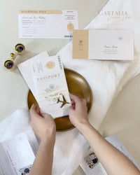 - Day Invitation (Passport) + RSVP (Boarding Pass) + Pearl Ribbon Tie + Envelope.