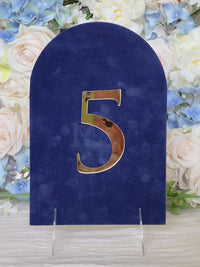 This exquisite table number, designed and crafted to perfection, features a freestanding card made from luxurious velvet material.