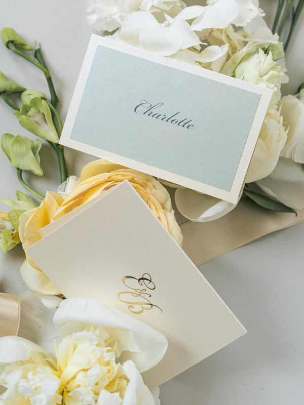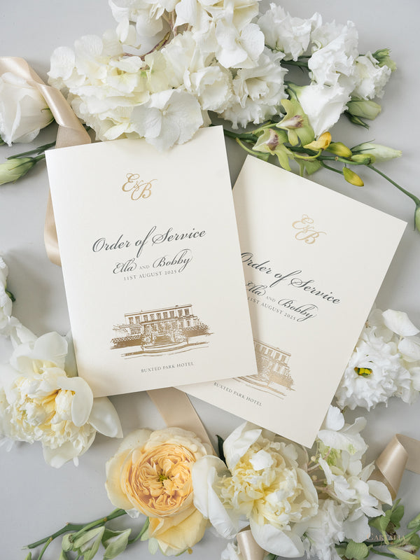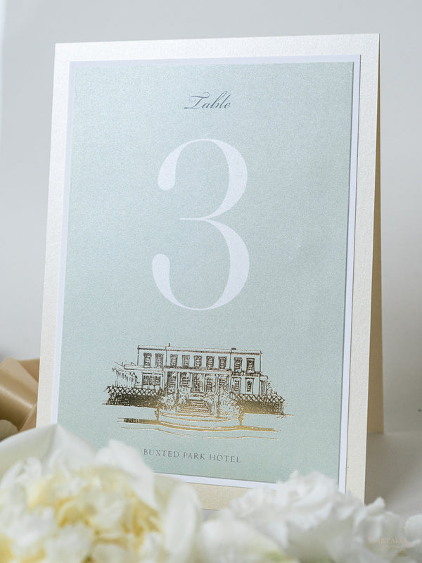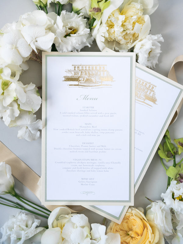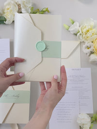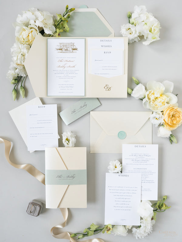 Your Venue taking centre stage with this Beautiful Gold Foiled Venue Suite in Classic Envelope Fold Pocket you can hold multiple cards for your guests, featuring your monogram in gold foil and on bespoke wax seals, this bespoke commission was made in Sage Green and Champagne.