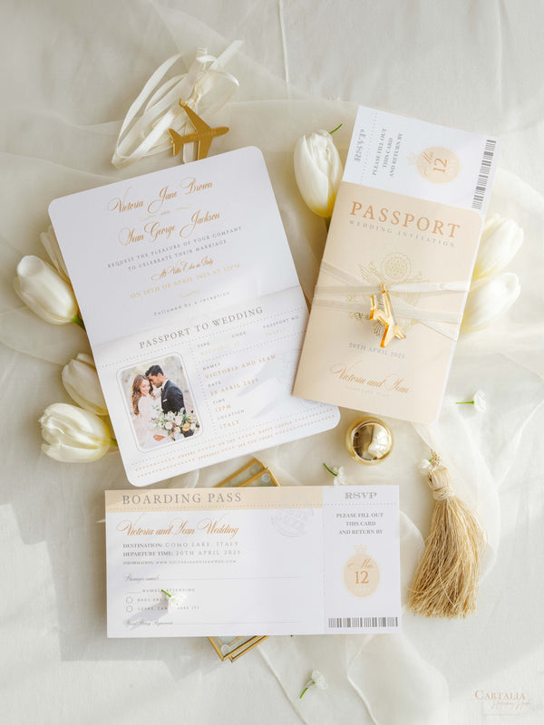 Invitaciones para pasaporte de piel color nude de primera calidad con lámina dorada y grabado personal
