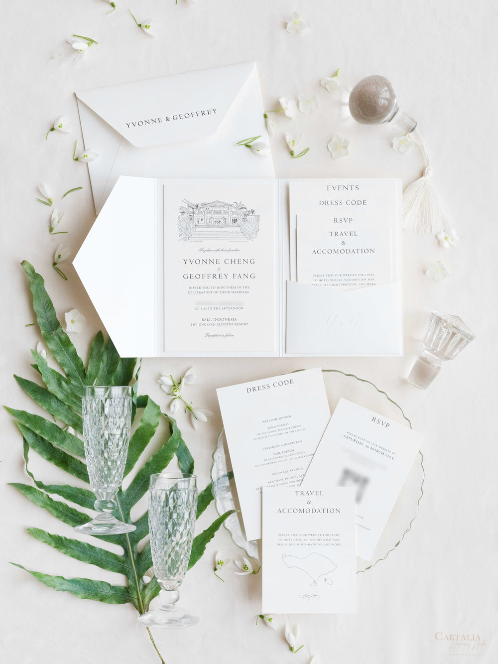 Invitación de boda en acuarela con tu lugar | Bolsillo de lujo con tipografía y sobre con borde adornado