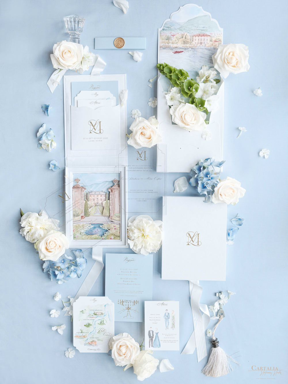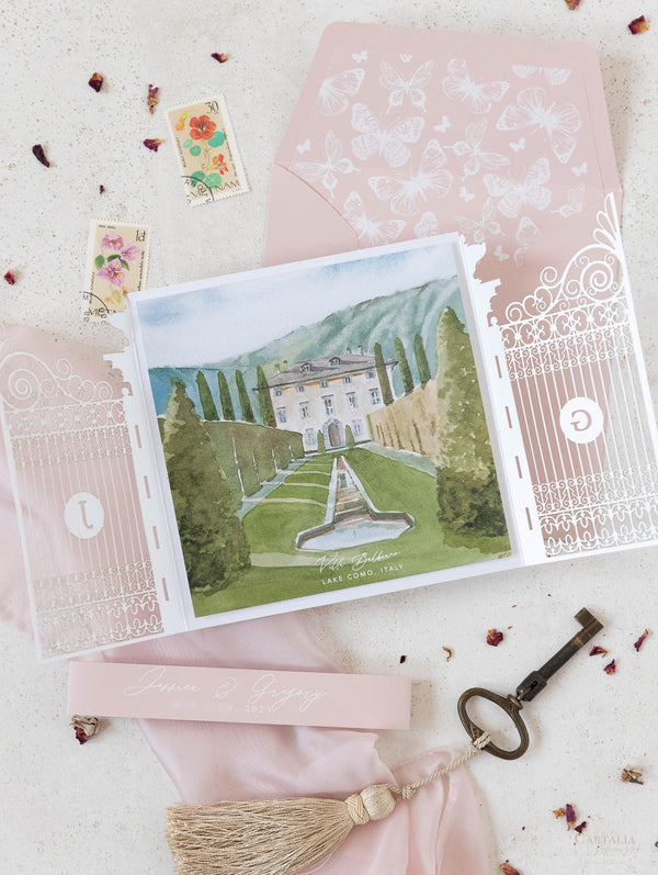 Suite de invitación de boda de lujo Villa del Balbianello | Folio estilo bolsillo con lugar de acuarela y lámina dorada | Boda en el lago de Como