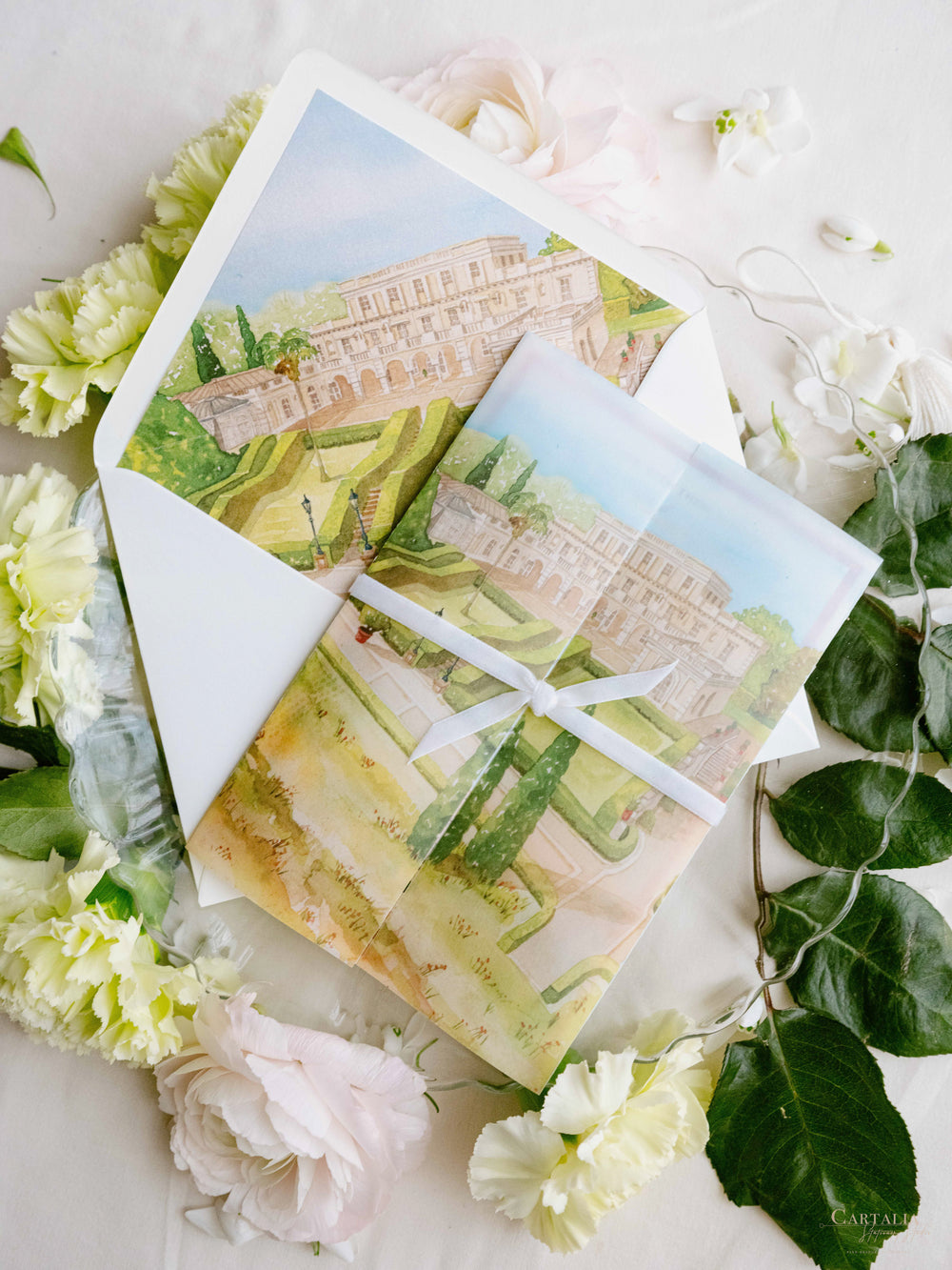 Watercolour Vellum Wrap Villa Miani Invitation with Velvet Ribbon | Bespoke Comission for I&B