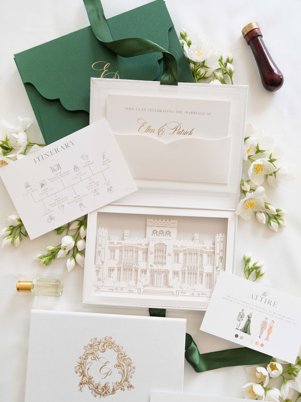 Green Luxury Linen Hard Back Folio Invitation with Gold Foil, Embossing & Letterpress Finishes | Watercolour of Villa Pizzo, Lake Como, Italy