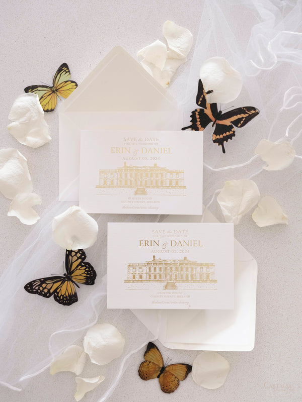 Tipografía Guardar la fecha con boceto del lugar de lámina dorada | CASA GLOSTER