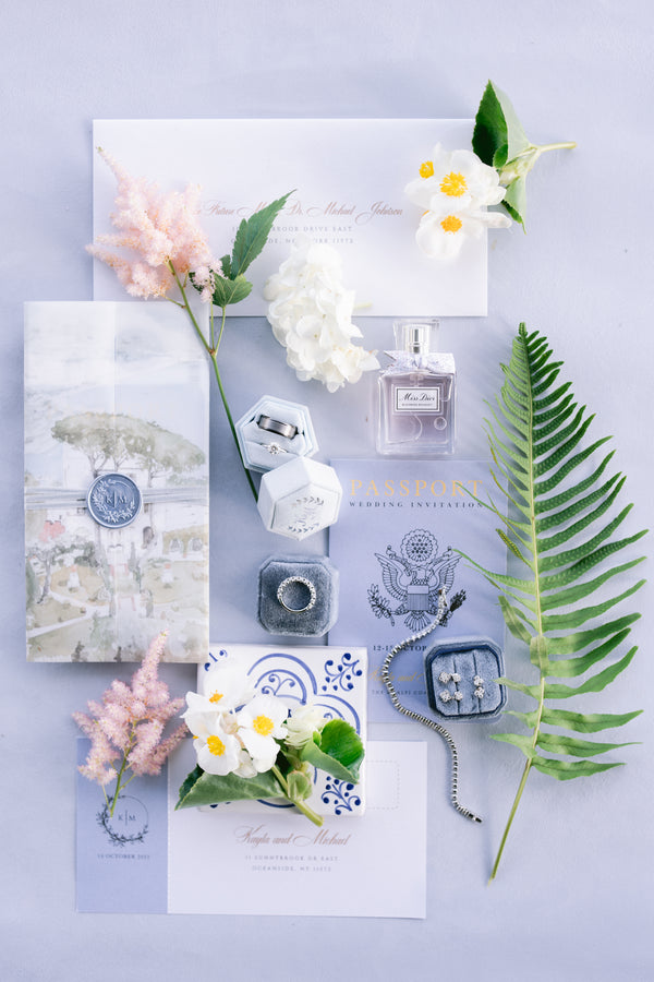 Suite de invitación para pasaporte con diseño personalizado de acuarela en pergamino | Villa Eva, Ravello, Costa de Amalfi