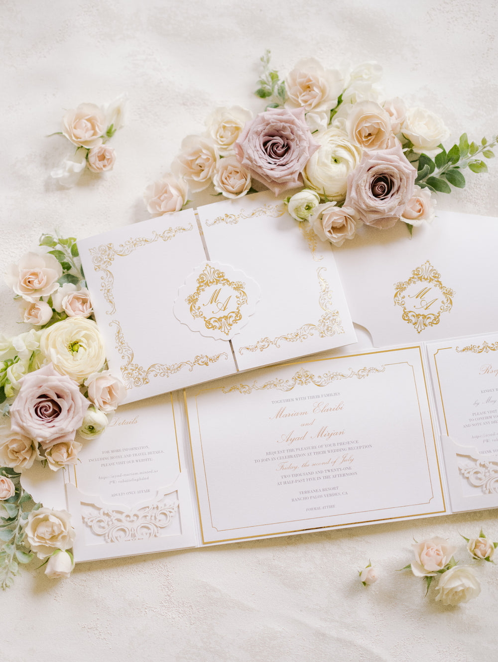 Suite plegable de bolsillo de invitación de lámina dorada de lujo para el día de la boda, confirmación de asistencia, tarjeta de información con bolsillo cortado con láser, guión de caligrafía