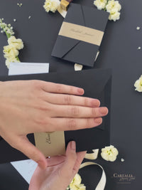 Introduzca elegancia sin esfuerzo en su día especial con esta invitación de bolsillo, que presenta exteriores en negro intenso y detalles en lámina dorada con una banda para el vientre hecha a medida para unirlo todo.