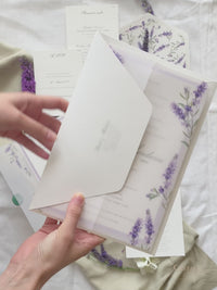 Esta exquisita invitación, inspirada en la belleza de Provenza, Francia, presenta una encantadora mezcla de tonos oliva y lavanda. El monograma verde añade un toque personalizado, mientras que el sello de cera añade un detalle de acabado sofisticado y atemporal.