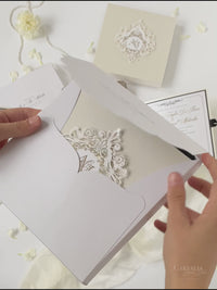 Diseño a medida en impresionantes colores champán, dorado y negro, con estampado en caliente y relieve con tarjetas insertadas y corte láser personalizado, encerrado en una caja personalizada y un sobre en caja con iniciales en relieve y un impresionante forro personalizado.