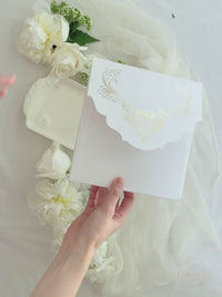 La invitación "Bespoke Elegance" es el epítome del diseño refinado. El blanco, los delicados tonos marfil y los detalles dorados crean un efecto único. Además, el monograma en lámina dorada añade un toque personal.