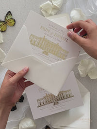 Tipografía Guardar la fecha con boceto del lugar de lámina dorada | CASA GLOSTER