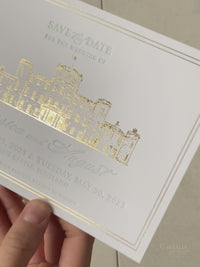 Tipografía Guardar la fecha con boceto del lugar de lámina dorada | Comisión J&A a medida