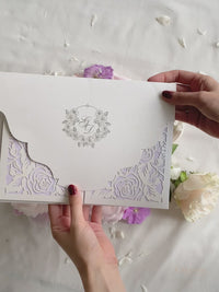 Nuestra suite Luxury Roses Silver Foil & Lilac Invitation Pocketfold ofrece una invitación elegante y personalizada hecha con la máxima atención al detalle. Elaborada con una combinación de lila y plata, la suite plegable presenta un impresionante detalle de rosas cortadas con láser y delicados detalles en lámina plateada, creando una manera hermosa y única de invitar a sus invitados especiales.