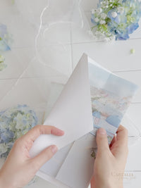 Passport Invitation Suite with Custom Vellum Watercolour Design | Santorini, Greece