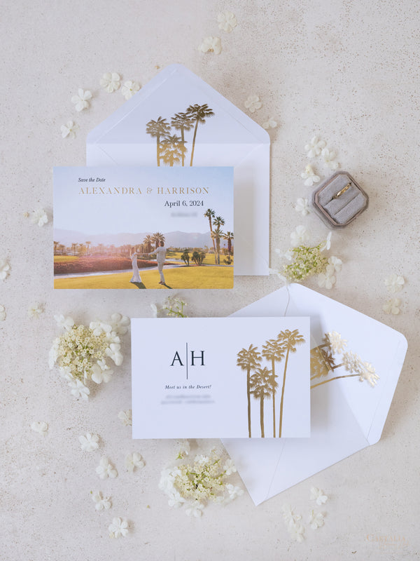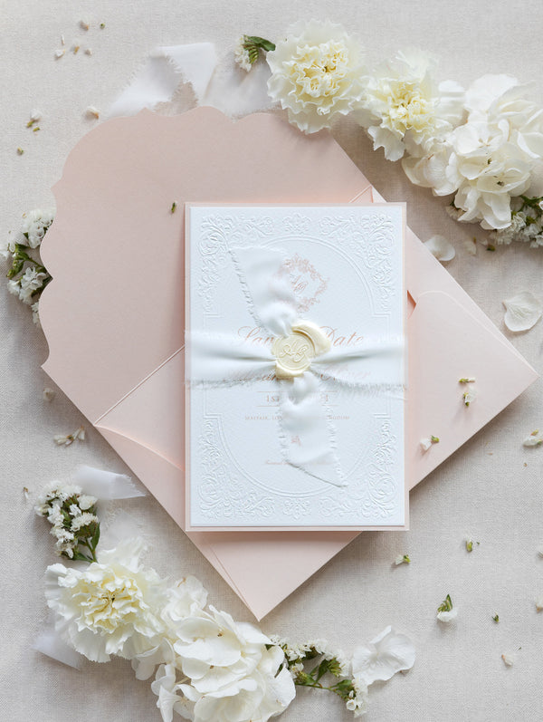 Diseño a medida para A&O para guardar la fecha, con sobre en relieve y rubor y cinta personalizada rasgada a mano con sello de cera personalizado