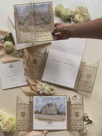 La comisión del lugar está realizada por un artista y ofrece la pintura a mano del lugar de su boda junto con un franqueo original en acuarela; puede comprar este complemento aquí