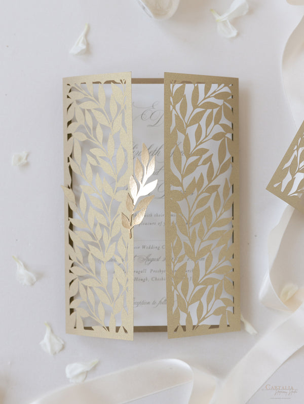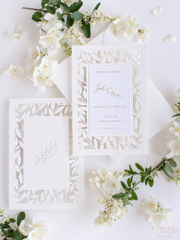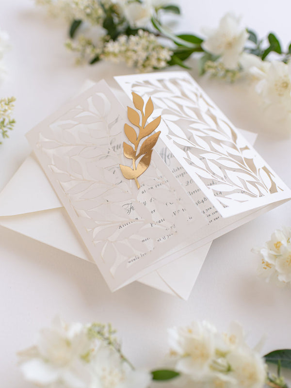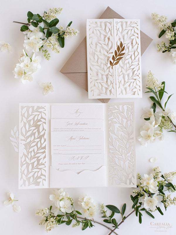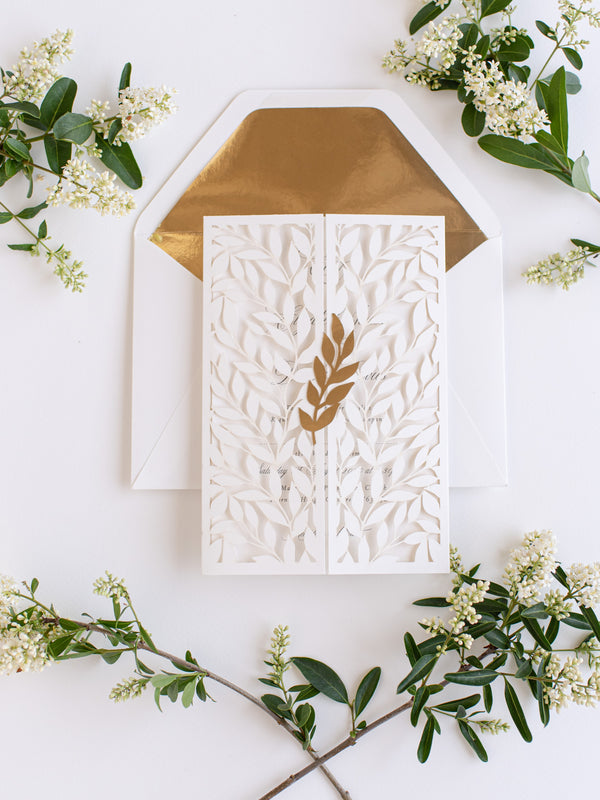 Bolsillo con 4 inserciones en arco blanco con hoja intrincada cortada con láser y lámina dorada.